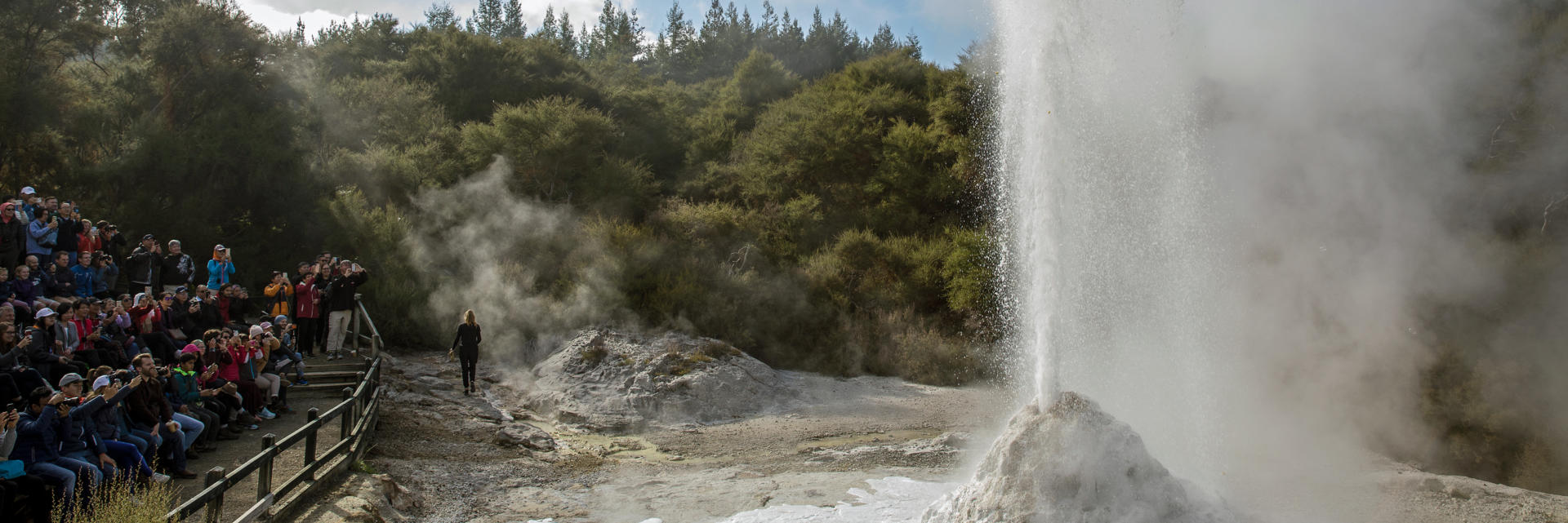 Wai-o-tapu (meaning sacred waters) is one of the Taupo Volcanic Zones most impressive active thermal areas. The wonderland of stunning geothermal activity on display is represented by names given to features in the park such as the Champagne Pool, the Artist’s Palette and Primrose Terrace. The Lady Knox Geyser is tempted into action at 10:15 each morning through the application of a surfactant and plays to a height of 20 m for up to half an hour. The park is located a short drive from SH5 between Rotorua and Taupo and was famously discovered by Europeans in 1901 when prisoners from a nearby camp observed that the soap they used when washing clothes in hot springs at the site prompted the eruption of a geyser. A further thermal park nearby at Waimangu was famous for a geyser that erupted regularly for hours at a time to a height of 460 m from 1900 to 1904.